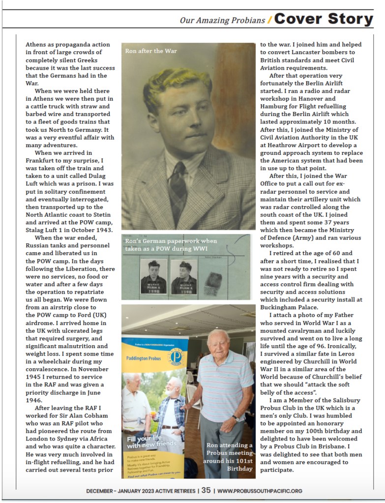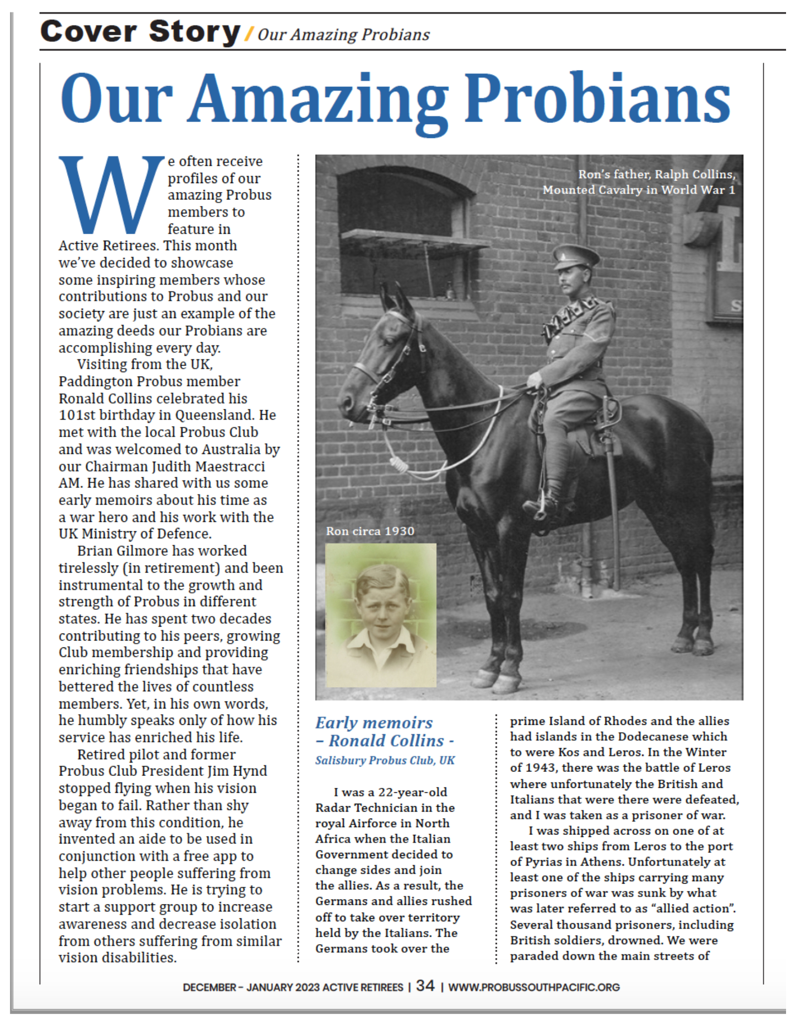 personnel came and liberated us in the POW camp. In the days following the Liberation. there were no services, no food or water and after a few days the operation to repatriate us all began. We were flown from an airstrip close to the POW camp to Ford (UK) airdrome. I arrived home in the UK with ulcerated legs that required surgery, and significant malnutrition and weight loss. I spent some time in a wheelchair during my convalescence. In November 1945 I returned to service in the RAF and was given a priority discharge in June 1946. After leaving the RAF worked for Sir Alan Cobham who was an RAF pilot who had pioneered the route from London to Sydney via Africa and who was quite a character. He was very much involved in in-flight refuelling, and he had carried out several tests prior to the war. I joined him and helped to convert Lancaster bombers to British standards and meet Civil Aviation requirements. After that operation very fortunately the Berlin Airlift started. I ran a radio and radar workshop in Hanover and Hamburg for Flight Refuelling during the Berlin Airlift which lasted approximately 10 months. After this, I joined the Ministry of Civil Aviation Authority in the UK at Heathrow Airport to develop a ground approach system to replace the American system that had been in use up to that point. After this, I joined the War Office to put a call out for ex-radar personnel to service and maintain their artillery unit which was radar controlled along the south coast of the UK. I joined them and spent some 37 years when it became the Ministry of Defence [Army] and I ran various workshops. I retired at the age of 60 and after a short time, I realised that I was not ready to retire so I spent nine years with a security and access control firm dealing with security and access solutions which included a security install at Buckingham Palace. I attach a photo of my Father who served in World War I as a mounted cavalryman and luckily survived and went on to live a long life until the age of 96. Ironically, l survived a similar fate in Leros engineered by Churchill in World War II in a similar area of the World because of Churchill’s belief that we should “attack the soft belly of the access”. I am a Member of the Salisbury Probus Club in the UK which is a men’s only Club. I was humbled to be appointed an honorary member on my 100th birthday and delighted to have been welcomed by a Probus Club in Brisbane. I was delighted to see that both men and women are encouraged to participate.”