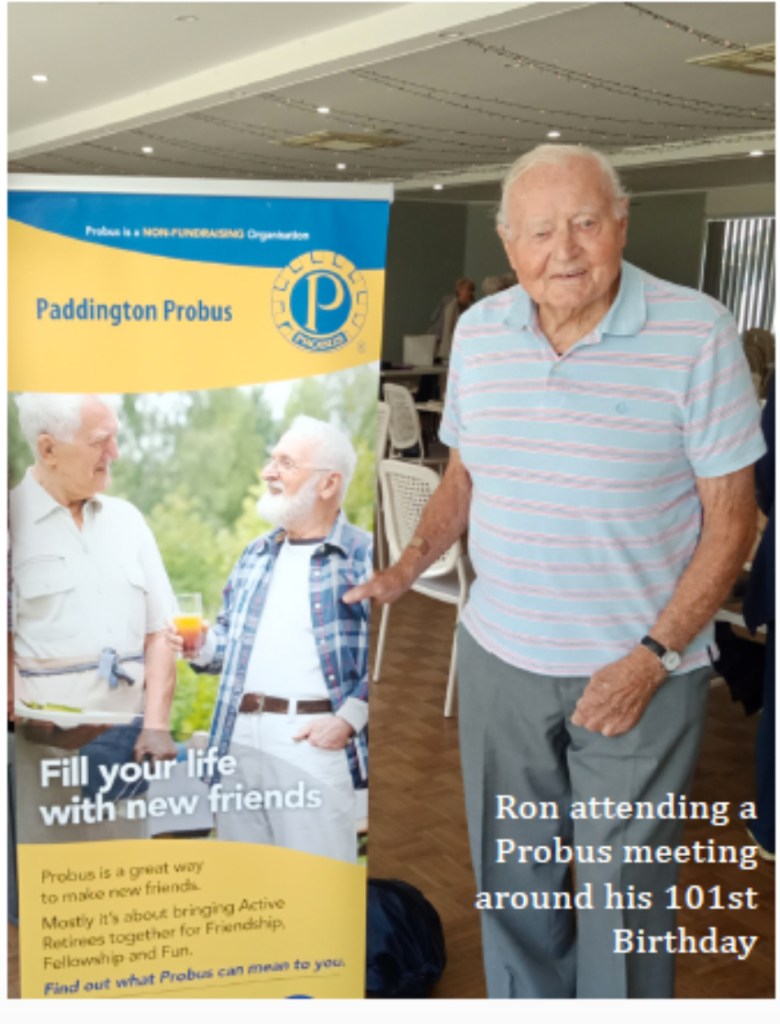 Ron Collins, our oldest member, is currently enjoying an extended holiday with relatives, in Australia. Ron has made the headlines of the local Probus Magazines, and we thought you might like to read his story. The article is reproduced here:
